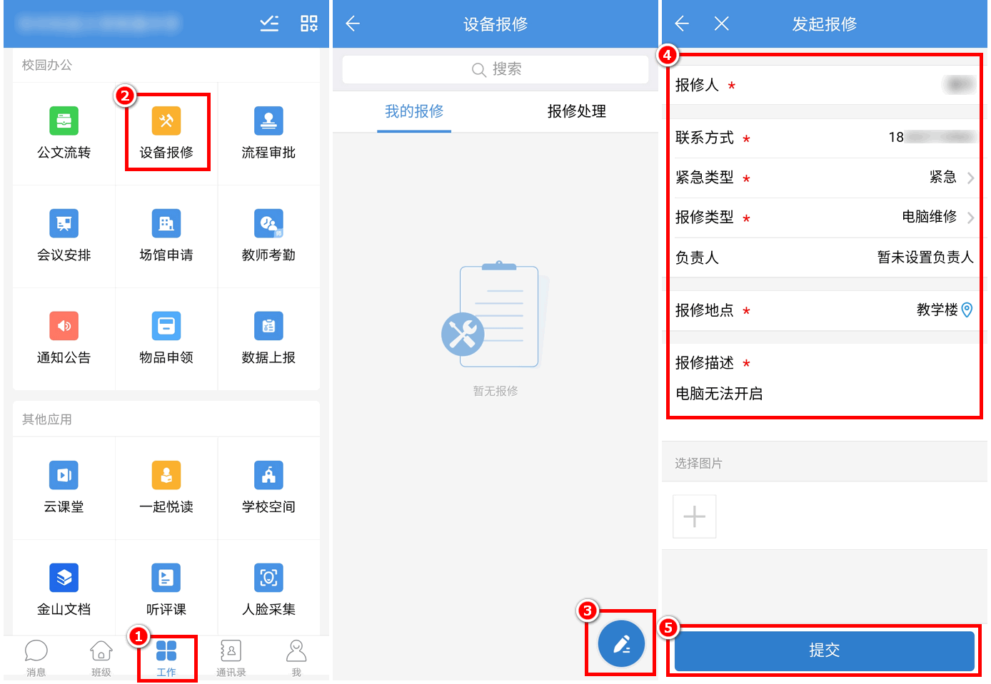 教师登录APP,点击底栏“工作”-“设备报修”进入,点击右下角笔状图标;填写联系方式、紧急类型、报修类型,报修地点、报修描述等相关信息,点击“提交”完成报修申请。