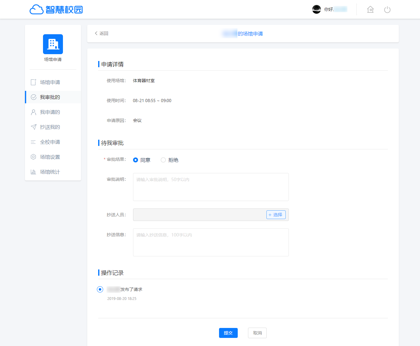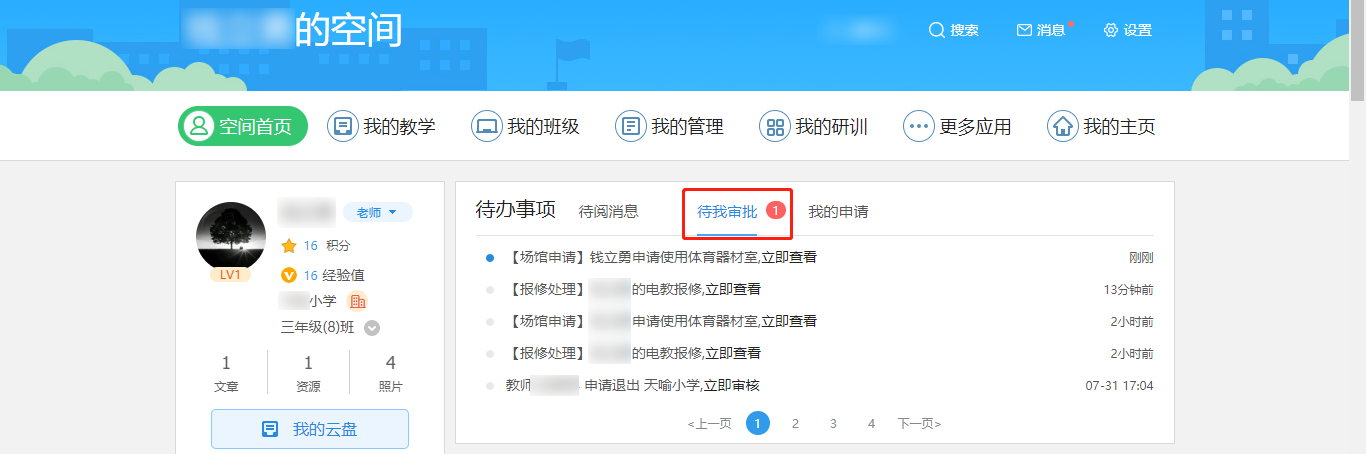 第一步:教师(场馆负责人)登录云平台,点击空间首页的“待办事项”—“待我审批”,可查看到学校老师提交的场馆申请,点击进入申请详情页进行审批;选择是否批准、填写审批说明,点击“提交”后则当前审批处理完成。