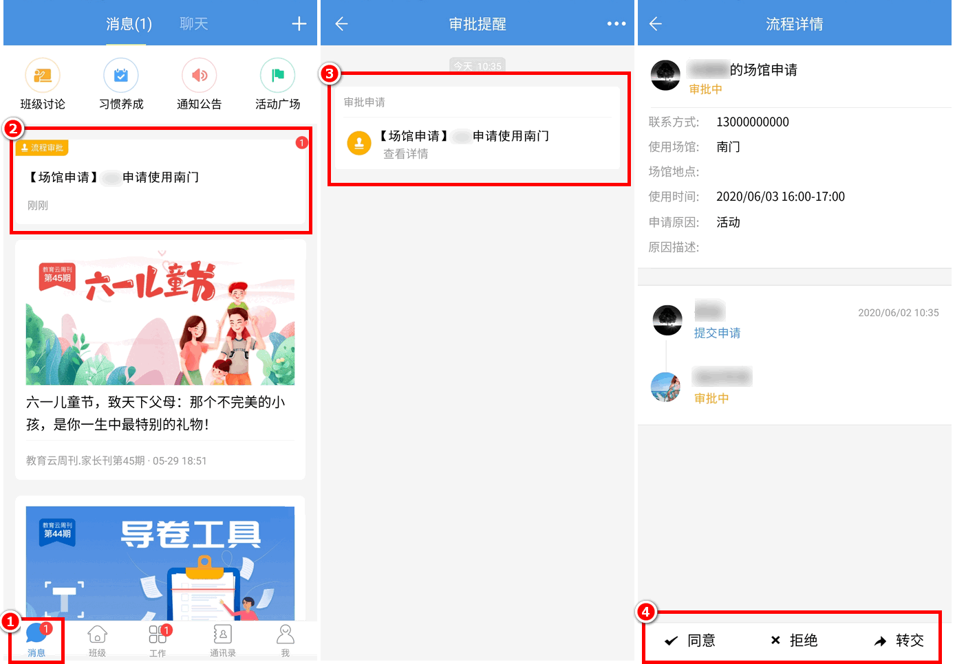 教师(场馆负责人)登录APP,通过首页“消息”可查看到老师提交的场馆申请,点击进入申请详情页进行处理,选择是否批准、填写审批说明,点击“提交”后则当前审批处理完成。