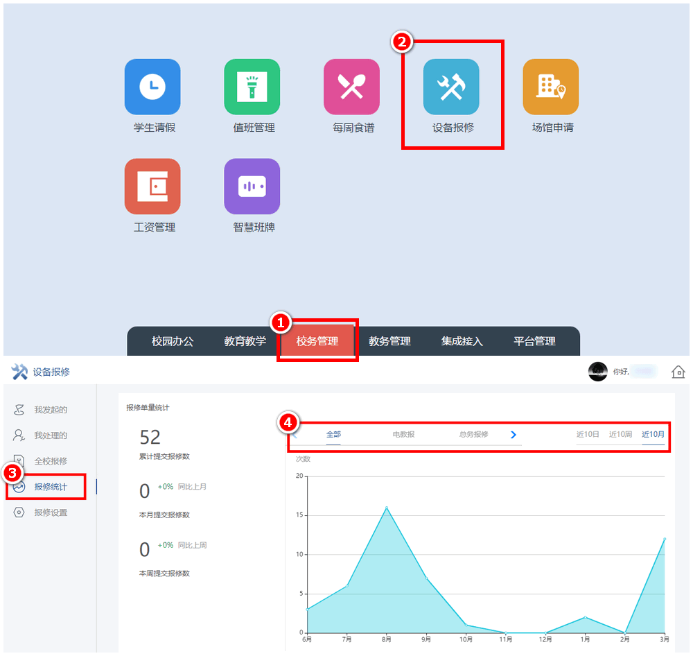 点击“报修统计”,选择部门、周期即可查看对应的使用数据统计。